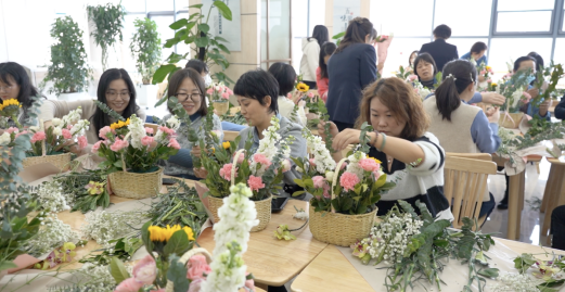 繁花似錦報春來,天姿國色抒情懷?;顒蝇F(xiàn)場花香四溢、芬芳溫馨,充滿著春天般的氣息,大家手捧鮮花,在花藝?yán)蠋煹闹v解下,開始學(xué)習(xí)各種鮮花所蘊含的花語祝福和選花、裁剪、搭配、造型及養(yǎng)護等藝術(shù)插花技巧。隨后,女工們將原本普普通通的月季、康乃馨、蝴蝶蘭、滿天星、向日葵等多種花材修剪整枝,根據(jù)不同的色彩和形狀有層次地搭配在一起。通過精心構(gòu)思造型、發(fā)揮創(chuàng)意想象,有的注重意境創(chuàng)設(shè)追求,有的突出枝情花韻之趣,有的抒展自然樸實風(fēng)格……在細致地修飾和精心地創(chuàng)作下,一枝花、一棵草都變得詩情畫意和清新怡人,節(jié)日的喜慶氣氛瞬間升騰。