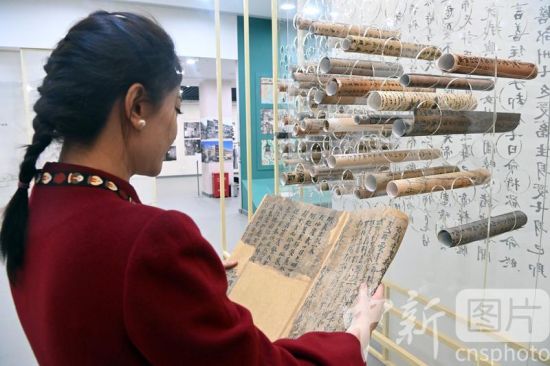 3月14日,敦煌研究院敦煌文獻(xiàn)研究所所長(zhǎng)趙曉星接受中新社記者專訪介紹稱,全彩印《敦煌文獻(xiàn)全集》出版工作已正式啟動(dòng),該叢書采用全彩印的方式刊布敦煌文獻(xiàn),實(shí)現(xiàn)敦煌文獻(xiàn)在線下圖錄中的高清還原。敦煌文獻(xiàn),又稱敦煌遺書,是指1900年在甘肅敦煌莫高窟藏經(jīng)洞發(fā)現(xiàn)的公元4世紀(jì)至11世紀(jì)的寫本、印本和拓片等文獻(xiàn)。據(jù)最新統(tǒng)計(jì)顯示,其總數(shù)近7萬件。目前這些文獻(xiàn)分藏于中、英、法、俄、日等國的數(shù)十家收藏機(jī)構(gòu),一直缺乏完整的聯(lián)合目錄。圖為3月3日,工作人員在敦煌藝術(shù)館卷軸墻前閱覽敦煌遺書影印品。 中新社記者 九美旦增 攝