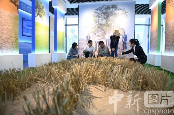 4月16日,甘肅省武威市古浪縣,學生們在八步沙兩山實踐創(chuàng)新基地參觀了解當?shù)靥禺a。