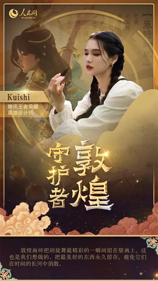 在敦煌千里之外的地方,騰訊的設計師們正在研發(fā)新的敦煌文化創(chuàng)新產(chǎn)品。熱門游戲《王者榮耀》的角色美術師Kuishi以莫高窟第220窟的壁畫為原型,為游戲角色設計了全新皮膚,將盛行于唐代的胡旋舞融入現(xiàn)代元素。
