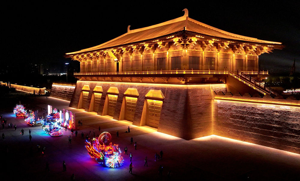 巡游彩車從西安大明宮國家遺址公園丹鳳門前駛過(2023年9月30日攝,無人機照片)。新華社記者 劉瀟 攝