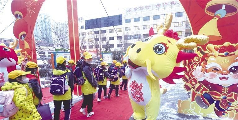 當日上午7時許,記者在蘭州市東郊學??吹?,校門內(nèi)兩邊擺放著兩條由數(shù)百個氣球組成的長龍。高年級段和低年級段的學生要穿越寫著“龍騰虎躍,前程似錦”的龍門,方可進入教室。同時,兩邊的老師,給每一位到校的學生發(fā)放小禮物。記者注意到,每個孩子都領(lǐng)到了一個小盲盒,里面裝著不同的文具。孩子們高興地揮舞著手中的盲盒,展示新春的快樂。