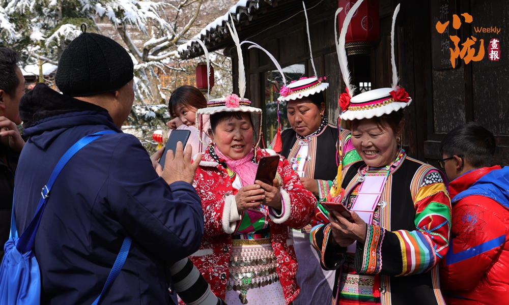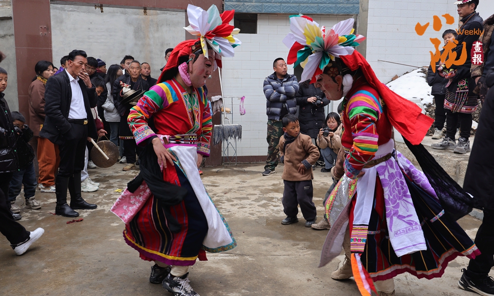河畔的小路上和河岸的觀景臺(tái)上,白馬人身著特色服飾,錯(cuò)落有致,載歌載舞,跳起了獨(dú)具魅力的“池哥晝”。