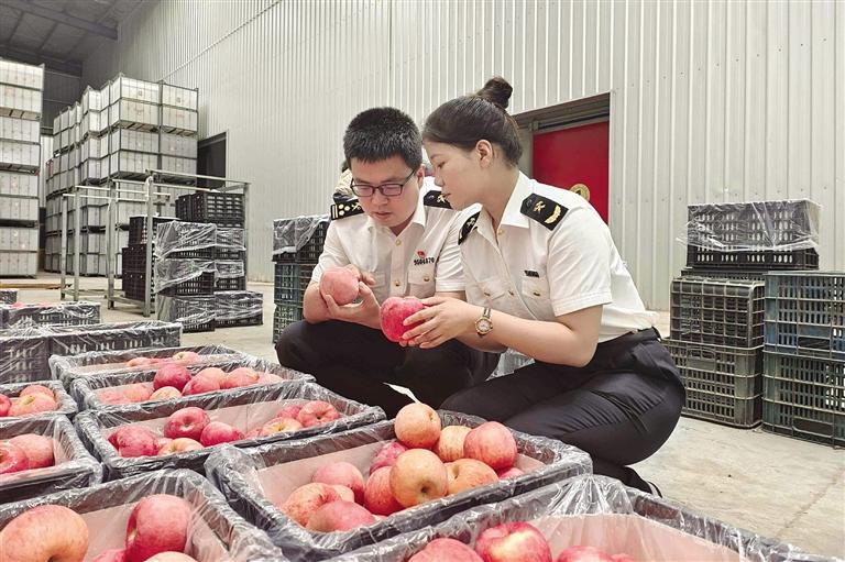 圖為海關關員檢查出口水果。據(jù)悉,上半年甘肅省出口水果價值4.56億元,同比增長42.7%。