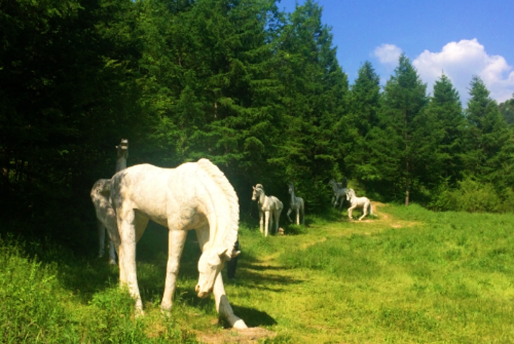 在碧草連天的谷地,當(dāng)?shù)芈糜尾块T擺放了一組白馬的大型雕塑,栩栩如生,它們要么仰天長(zhǎng)嘶,要么低首撫弄地上的青草,還有的彼此耳鬢廝磨,像是親密的戀人。