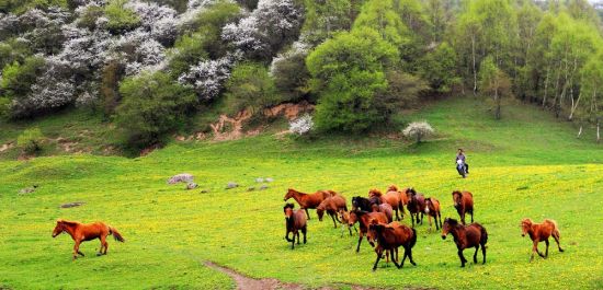 在村外的一處山谷終于發(fā)現(xiàn)了人工飼養(yǎng)的馬群,水勢(shì)潺潺的小溪讓草坡變得松軟無(wú)比,規(guī)模不是很大的馬群幾乎是靜止的,它們的姿態(tài)是閑適、是優(yōu)美,不再繃緊得像沙場(chǎng)上的離弦之箭,此時(shí)它們的身心徹底松弛下來(lái),正傾心于口鼻間彌散了陽(yáng)光味道的草葉。