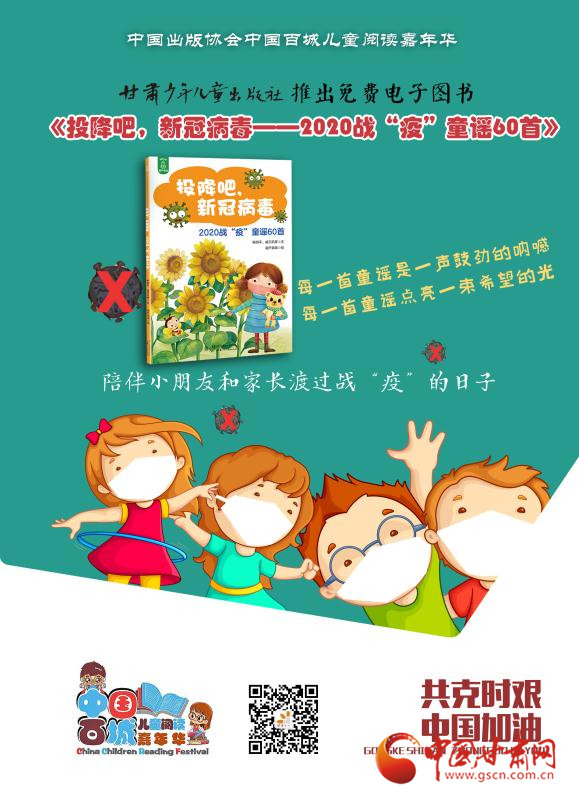 庚子之春,新冠肺炎疫情爆發(fā),全國人民奮力投身到這場疫情防控阻擊戰(zhàn)中,孩子們、兒童文學(xué)作家也紛紛創(chuàng)作了大量優(yōu)秀的童謠。2月份,讀者出版集團(tuán)旗下甘肅少年兒童出版社(以下簡稱:甘肅少兒社),策劃上線了免費公益數(shù)字出版物《投降吧,新冠病毒——2020戰(zhàn)“疫”童謠60首》。書中收錄60首優(yōu)秀童謠作品,對兒童進(jìn)行防疫科普宣傳,以期提高兒童科學(xué)防護(hù)意識和戰(zhàn)勝病毒的信心。一首首童謠匯集起來,架起了孩子和家長共同抗疫的橋梁,也點亮了孩子們用稚嫩的眼光和思維認(rèn)識這場災(zāi)難的微光。