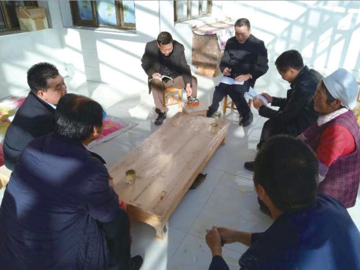 高凱、王志祥等在羊永鎮(zhèn)白土村二社王石山保家調(diào)研安全飲水事宜。 王曉忠 攝