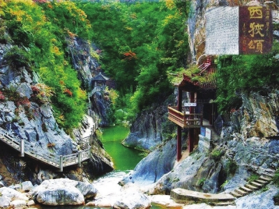 由于路況寬闊平整,從成縣縣城驅(qū)車西行二十分鐘至東入口,便來到了號(hào)稱青山綠水間的書法博物館的魚竅峽,這里就是著名的西狹頌風(fēng)景區(qū)。“光怪靈潭氣欲春,波平浪靜一輪存。鏡連五色龍成彩,珠映千鱗月映痕。”果然,這方寶地清幽綺麗,青山對峙,澗流清澈。峽內(nèi)的山、水、石、樹,皆成風(fēng)景;亭、橋、廊、榭,相映成趣。舉目環(huán)望,山崖上綠樹層疊,其間亦或有古樹參天,老藤纏繞。兩山之間的響水河,或在峽谷中潺潺繞行,或在巨石間沖騰奔瀉,浪花激起的水聲。更美的是懸崖上的水,化成一條白練從高處垂落而下,直泄黃龍?zhí)?。西峽飛瀑“龍?zhí)队吃?rdquo;便成為成縣著名的八景之一,至今為世人津津樂道,贊嘆不已。