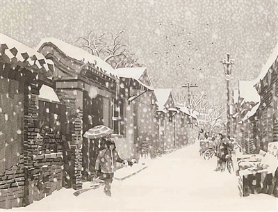 休息日,大雪天,況晗背著畫具出門作畫。濕式水彩畫,講究水色淋漓,是用排筆將清水洇濕畫紙然后作畫。一幅寫生未成,畫筆已然結(jié)冰。況晗的家鄉(xiāng)氣候濕潤(rùn),墻縫里面生的是青苔。北京的氣候干燥,墻縫里面積存的是數(shù)百年的塵土。家鄉(xiāng)村野的色調(diào)是青綠,京城胡同的色調(diào)是灰白,于是況晗改用寬線條鉛筆畫來寫意胡同。