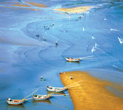 功夫不負(fù)有心人。經(jīng)過(guò)漫山遍野地毯式的尋覓,鄭德雄一行把霞浦海灘的拍攝點(diǎn)摸了個(gè)遍,也拍出了一幅幅漂亮的好作品。那照片上的霞浦真是美?。核{(lán)色的海水,金色的沙灘,種海帶的竹竿依序林立,滿(mǎn)載的漁船停泊在靜靜的港灣,趕海人背著沉甸甸的魚(yú)簍,正走在金色的沙灘上……