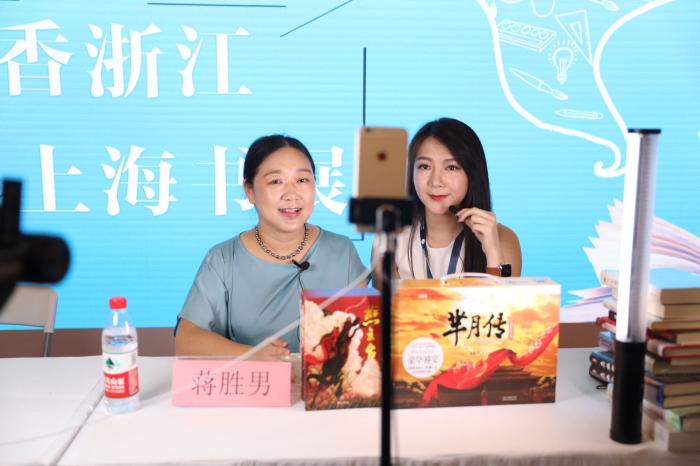 作家蔣勝男在上海書展與網(wǎng)絡達人直播中。浙江文藝出版社供圖