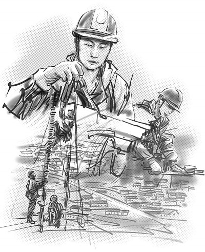 就個(gè)人條件而言,胡洪煒一米八的身高其實(shí)并不適合帶電作業(yè),但三年軍營練就的結(jié)實(shí)精壯以及先天的敏捷機(jī)靈完美地補(bǔ)充了身高的短板。多年之后,閆旭東依然清晰地記得徒弟曾經(jīng)帶給他的震撼。帶電作業(yè)兩大危險(xiǎn),一是高空,一是帶電。軟梯是電力人得以騫翮遠(yuǎn)翥的依傍,可攀爬軟梯卻一度打濕了胡洪煒振翅欲飛的翅膀。新員工入職培訓(xùn)的訓(xùn)練場上,別人用一個(gè)月已經(jīng)熟練掌握了技巧,笨鳥胡洪煒卻剛剛及格。氣喘吁吁地爬到基塔的頂端,將自己蟄伏在離地面幾十米高的電線上,想像自己是一只俯瞰大地的鳥雀,一只暫時(shí)休整的雨燕,抑或是被印刷在音樂課本上的音符。音符在胡洪煒耳邊輕聲吟唱:我要飛得更高,更高!