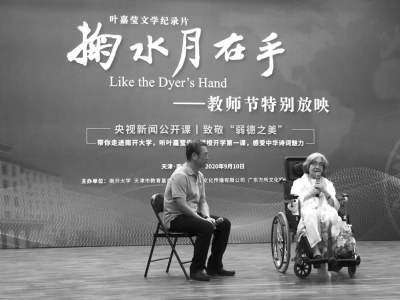 九月十日教師節(jié),南開大學(xué)舉辦《掬水月在手》影片首映式。葉嘉瑩先生是國際儒聯(lián)榮譽(yù)顧問,我銜命陪同王念寧副會(huì)長(zhǎng)專程赴南開致賀,有幸在南開禮堂聆聽九十六歲高齡的迦陵先生與白巖松共話詩意人生。迦陵先生坐在輪椅上娓娓道來,鬢發(fā)皤然,聲如洪鐘,風(fēng)華絕代。