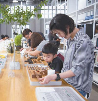 在泰國創(chuàng)意與設(shè)計中心圖書館,來訪者正在位于二層的材料體驗區(qū)參觀。泰國創(chuàng)意與設(shè)計中心圖書館供圖