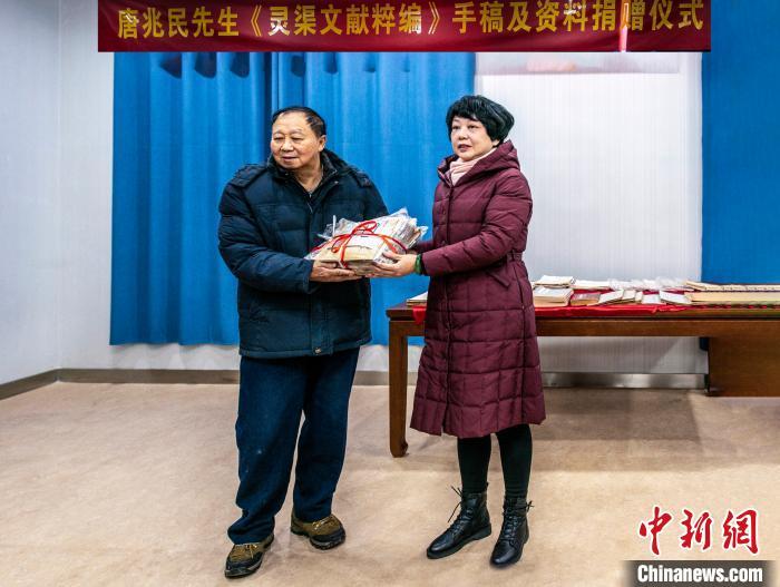 “卅載青燈知苦樂,一篇黃卷薈磯珠。”捐贈(zèng)現(xiàn)場(chǎng),唐兆民兒子唐丁寧回憶其父親用四十年時(shí)間艱辛編撰《靈渠文獻(xiàn)粹編》出版后的感慨原話。
