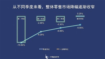 從時(shí)間軸來看,整體零售市場第一季度受疫情影響最為嚴(yán)重,同比下降15.93%,二季度復(fù)工復(fù)產(chǎn)復(fù)學(xué)急速收窄降幅,三季度同比下降3.3%,降幅略增,到第四季度回暖,同比出現(xiàn)小幅上漲,上升了0.25%。
