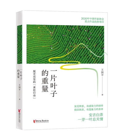 王國平報(bào)告文學(xué)《一片葉子的重量——脫貧攻堅(jiān)的“黃杜行動(dòng)”》寫的黃杜村,位于浙江省湖州市安吉縣,那里曾經(jīng)是個(gè)貧困山村。“一片葉子富了一方百姓”,在擺脫貧困的道路上,村民們艱苦奮斗,使黃杜村成為安吉白茶的重要產(chǎn)地,家鄉(xiāng)面貌煥然一新。