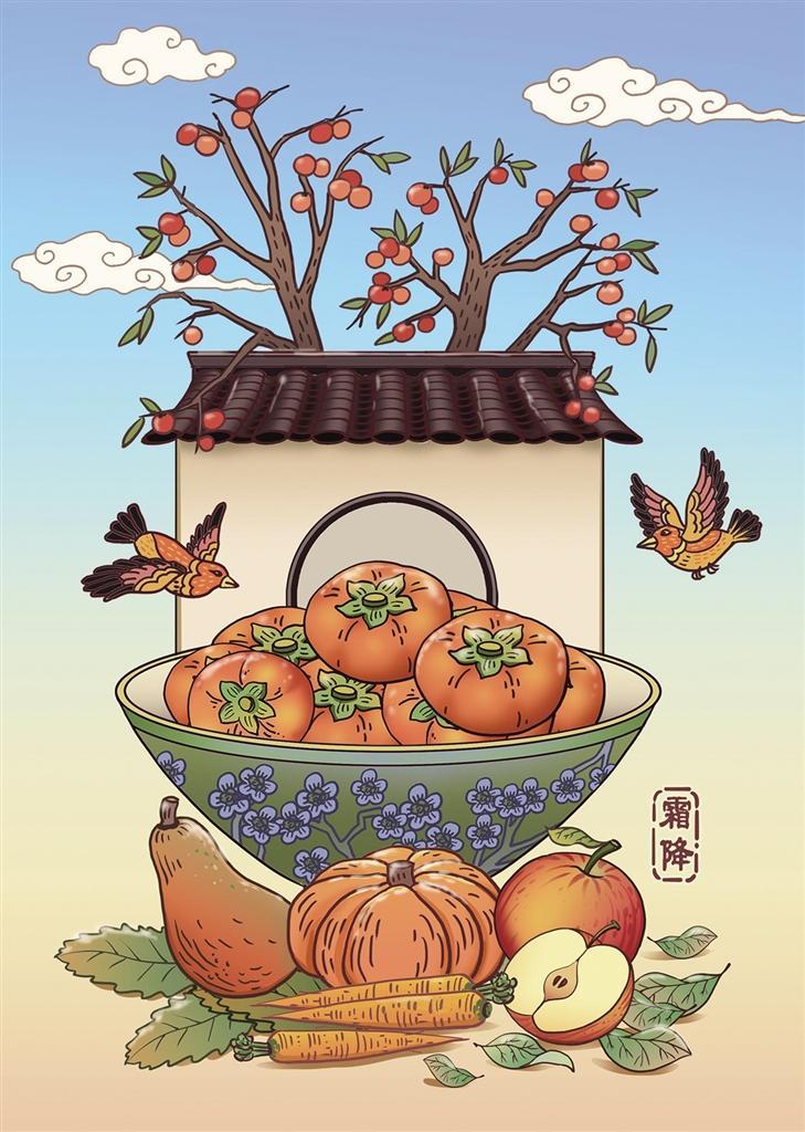 “對于節(jié)氣起源地區(qū)來說,‘霜降見霜花兒,立冬見冰碴兒’。”宋英杰表示:“雖然民間仍稱霜降為‘下霜了’,但在漢代,人們便已知曉霜是‘其由地發(fā),不從天降’的道理。因此,霜并非從天而降,而是遇物而凝。當(dāng)近地面的溫度低于0℃時(shí),水汽凝結(jié)成晶瑩的霜花或冰針。我們以‘凌霜做雪’形容性情的堅(jiān)韌,以‘飽經(jīng)風(fēng)霜’形容歲月的磨礪。‘風(fēng)刀霜?jiǎng)?rsquo;,霜被描述成一種鋒利的冷兵器,成為‘殺’的代名詞。”