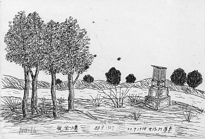 劉衍淮考察途中的畫作《額濟納河畔的觀測站》 (1927年9月28日)