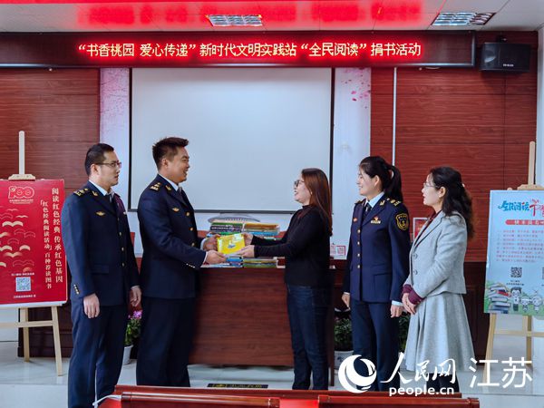 連云港航標(biāo)處向墟溝街道桃園社區(qū)捐贈圖書。張晗攝