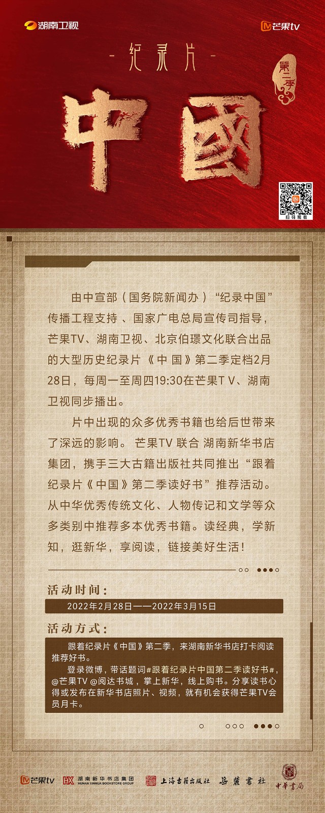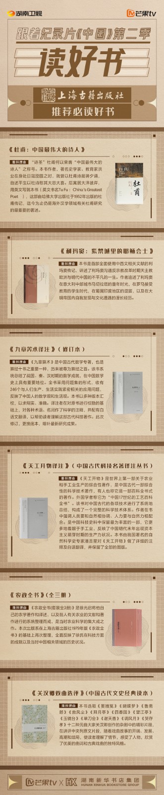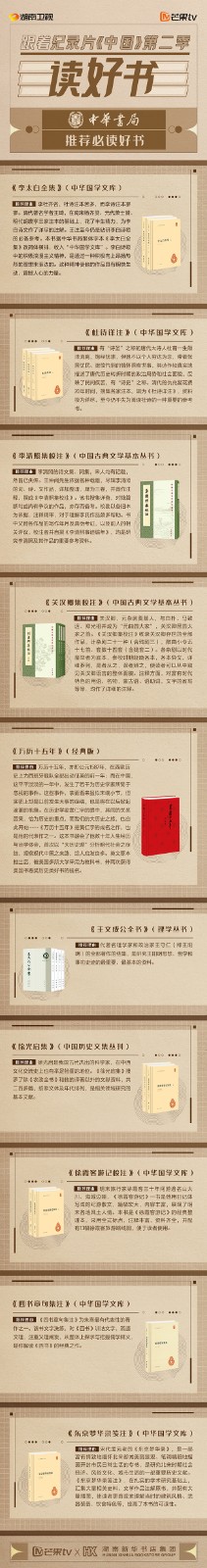 芒果TV以紀(jì)錄片《中國(guó)》第二季的精美品質(zhì),聯(lián)合湖南新華書店集團(tuán)的美譽(yù)口碑,將中華書局、上海古籍出版社、岳麓書社推薦的珍品好書,傾情向大眾推薦。本次“跟著紀(jì)錄片《中國(guó)》第二季讀好書”活動(dòng),將從2月28日持續(xù)到3月15日,湖南新華書店集團(tuán)旗下湖南圖書城、不吝Boolink書店、全省市級(jí)中心門店、長(zhǎng)沙地區(qū)樂之書店等全員參與,推薦紀(jì)錄片《中國(guó)》第二季。書友及觀眾可登錄微博或到線下門店打卡參與活動(dòng)。
