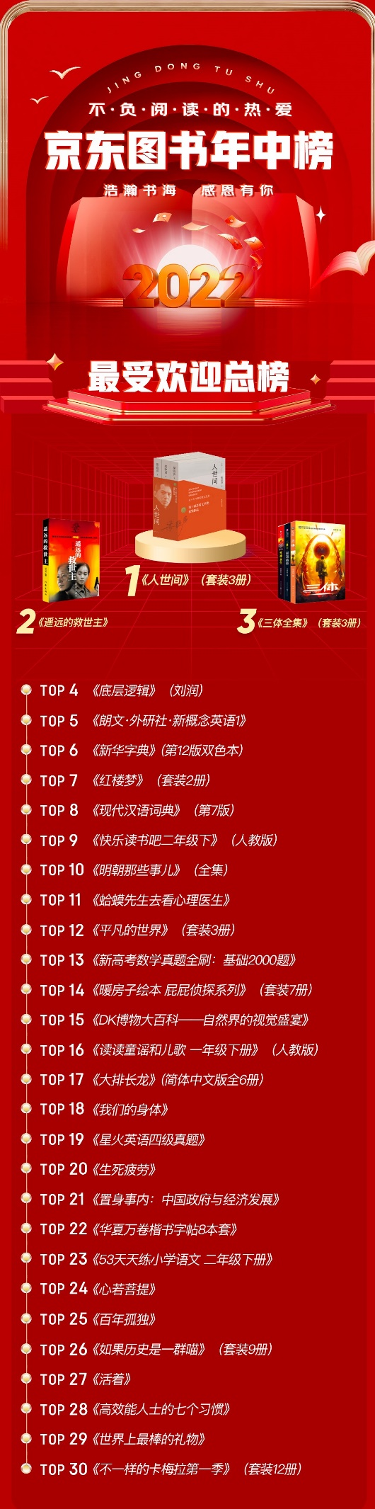 近日,京東圖書發(fā)布了2022年中圖書暢銷榜,包括總榜、新書榜,以及文學、經(jīng)管、童書、社科、科技、勵志、生活、藝術、文教、考試等10個類別的分榜,每個榜單均有30種圖書入榜,入榜圖書總數(shù)超過300種。