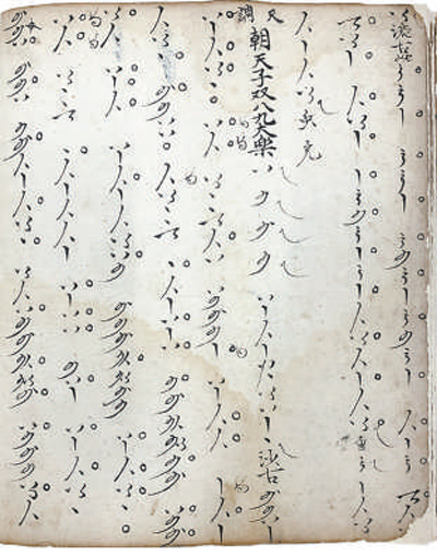 二是音位型曲譜,以各類符號指代樂器上的音位。使用這類曲譜,必須首先明確弦樂器的定弦、定品方式,管樂器的開孔標(biāo)準(zhǔn)和按孔、吹奏方法,才能確定每個(gè)音位的實(shí)際音高。正因如此,音位譜往往與樂曲宮調(diào)密切相關(guān)。同一份譜子,換用不同宮調(diào)演奏,音響大不相同。20世紀(jì)初,敦煌藏經(jīng)洞曾發(fā)現(xiàn)一份五代時(shí)期的曲譜,采用20個(gè)琵琶音位符號記錄,是目前已知這類曲譜的早期代表。