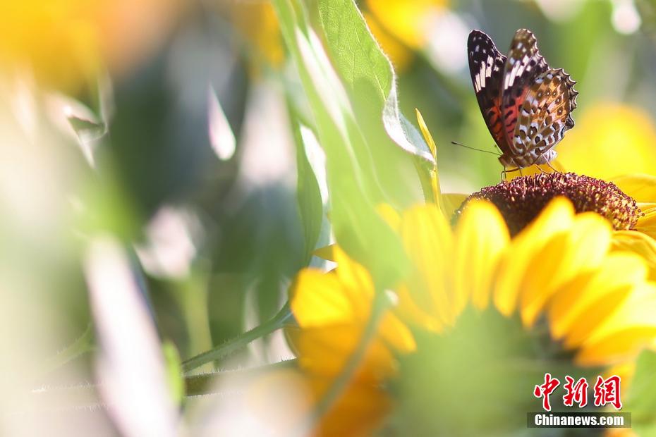 資料圖:圖為蝴蝶在向日葵上棲息。 泱波 攝