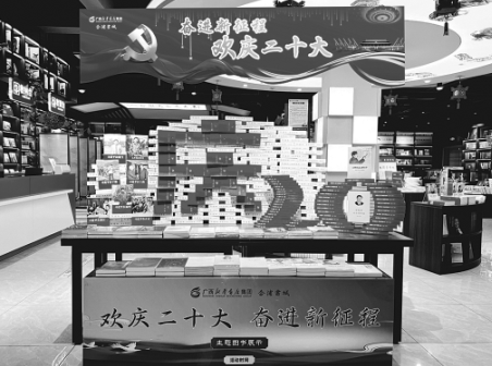 廣西新華書店集團股份有限公司組織全區(qū)各連鎖門店先后開展了“喜迎二十大 助力新發(fā)展”主題圖書展示展銷、“歡慶二十大 奮進新征程”主題系列活動。廣西新華書店集團股份有限公司相關負責人介紹,全區(qū)門店近期開展“歡慶二十大 奮進新征程”主題門店美陳大賽,通過精選出111個全國近期出版的主題圖書品種進行重點展示,配套主題海報、背景板,以各門店融合當地特色的碼堆造型進行整體美陳,向廣大讀者推薦一批導向正確、質量上乘的優(yōu)秀主題圖書。