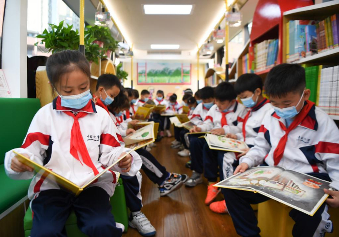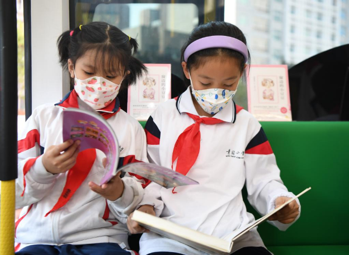 11月10日,學(xué)生在長(zhǎng)沙市青園友誼小學(xué)巴士圖書館內(nèi)閱讀。