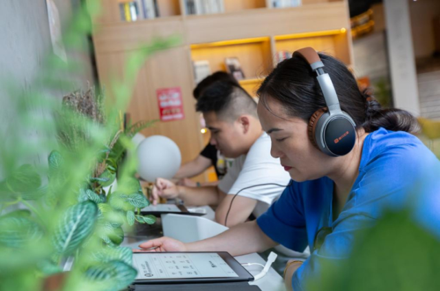 5月16日,在南昌市孺子書房·東湖意庫(kù)館,讀者利用聽書機(jī)體驗(yàn)在線閱讀。