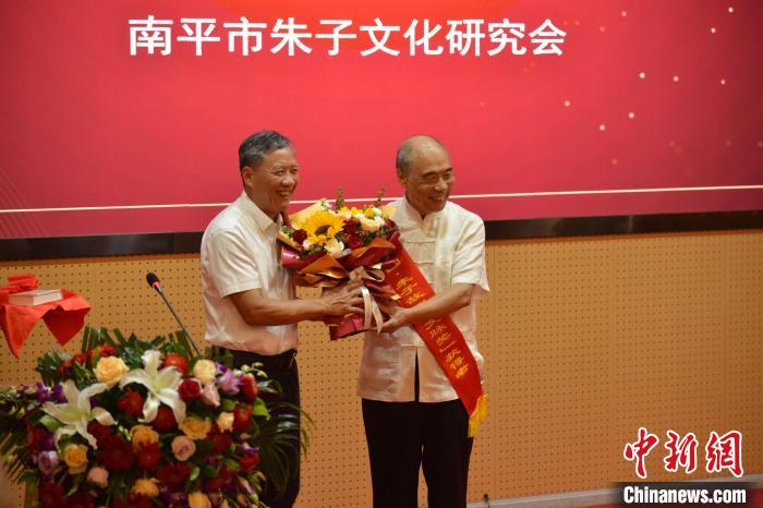 圖為第五屆“文脈獎”授予武夷文化研究院名譽(yù)院長吳邦才(右)?!∪~國寶 攝