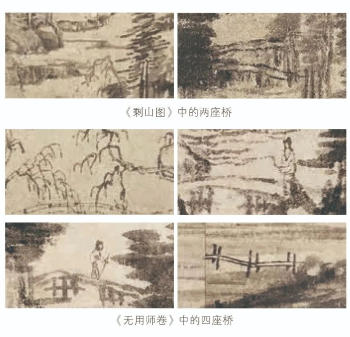 《富春山居圖》全卷共畫(huà)有六座橋,其中《剩山圖》上有兩座橋,《無(wú)用師卷》上有四座橋。讓我們先找到其中的一座橋,它在梁詩(shī)正書(shū)寫(xiě)的“鑒定”開(kāi)頭部分正下方。你有沒(méi)有發(fā)覺(jué),這座橋最為特殊。