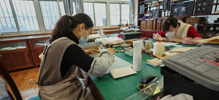 為了讓更多人了解古籍修復工作,天水市圖書館每年舉辦中華傳統(tǒng)曬書活動、書籍函套技藝培訓等,李東暉和同事們帶領讀者感受雕版印刷技術、學習制作書籍函套等。