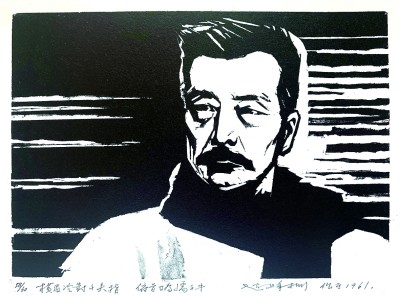 1935年5月28日,魯迅收到賴少其所作木刻《魯迅先生》,為了便于發(fā)表,將其改名后主動推薦到《文學(xué)》,并于6月29日回信:“巨大的建筑,總是一木一石疊起來的,我們何妨做做這一木一石呢?我時常做些零碎事,就是為此。”畫中一支明燭在沉沉的墨色中劃出一片的光明,只見一本翻開的厚書上,左頁印著一幅寫有“阿Q”字樣的木刻畫,右頁的祥云之上是搖旗吶喊狀的人群,下方靜靜地躺著一支鵝毛筆。與燈臺相映成趣的是處于中間位置的一罐墨汁,瓶身上刻著一個魯迅頭像,頭像雖然很小,但魯迅濃黑的胡須、清瘦的面容清晰可見,仿佛透出幾分懾人的冷峻。