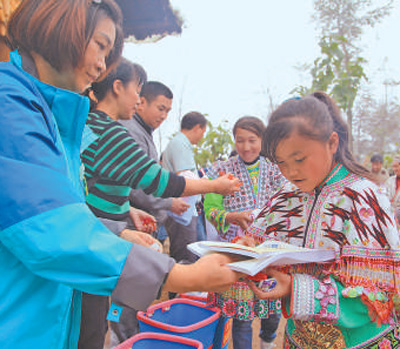 志愿者在為村民和孩子們發(fā)放圖書(shū)、文具等。張廣玉攝