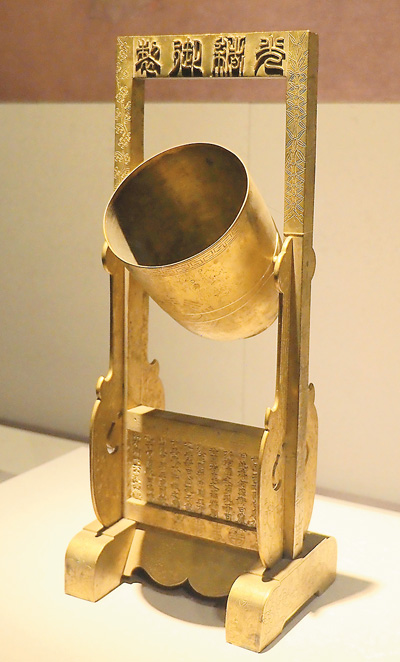 一件造型獨特的金色器物吸引了記者注意。達(dá)微佳介紹,這是故宮博物院藏清代銅鍍金欹器。欹器是一種傾斜易覆的盛水器,中空時,會向一側(cè)傾斜;注水一半時,能保持端正;水注滿時,會傾覆倒出,生動展現(xiàn)了儒家“不偏不倚,無過不及”的中庸之道。據(jù)文獻(xiàn)記載,孔子曾在魯桓公之廟觀欹器,并向?qū)W生講解它的道理。古時國君將欹器置于座右,作為修身之戒,因此又稱“宥坐之器”。