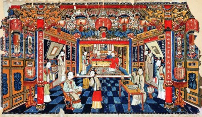 整幅年畫為我們呈現(xiàn)了一個(gè)處處燈光相映、人人語笑喧闐的祥和景象。畫中人物采用中國繪畫技法,線描敷色均呈現(xiàn)平面化特征,而居室空間則采用在清代稱為“線法畫”的技法,借鑒西方焦點(diǎn)透視法,使畫面產(chǎn)生立體感,將觀者的目光緩緩引入熱鬧溫馨的場景之中。