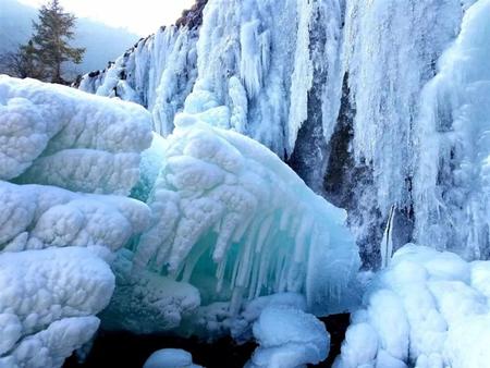又一簾冰瀑,一個(gè)冰美人恬靜地睡著了,美麗的公主中了魔咒,魔說,解咒,冬日,來官鵝溝賞玩美景的王子從這簾冰瀑前走過時(shí),脫去了棉袍棉衣,用他炙熱的肉身撲向了冰瀑,冰融化了,公主活了。她用夜鶯般美妙的歌喉唱著以身相許的羌族情歌:“豆子開花頭對(duì)頭,燕子飛過繡花樓,妹是燈盞哥是油,一根稔子陪到頭”。王子和公主緊緊擁抱在一起的時(shí)候,終年積雪的擂鼓山,雪融冰化,雪水從高山草甸經(jīng)過,暗香浮動(dòng),十萬畝杜鵑花兒盛開了。雪水從茫茫林海經(jīng)過,水草豐美,珍禽異獸飲用著這雪山的瓊漿玉液,毛色發(fā)亮。雪水從山崖跌落到溝谷,在河灘???,形成天然各異的湖泊,湖水清澈透明,隨湖底地貌高低呈不同顏色,藍(lán)天白云青山古樹映入湖中,天地渾然一體,天庭瑤池,最美也無非如此了。