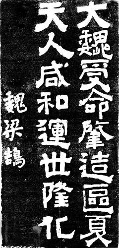 他的書法作品中,具有代表性的是一幅“大魏受命,肇造區(qū)夏,天人咸和,運(yùn)世隆化”的字。這幅字今人能看到拓片。人們評價說:書跡骨氣凝重,筋力豐足,筆勢雄健,意志戇宕。