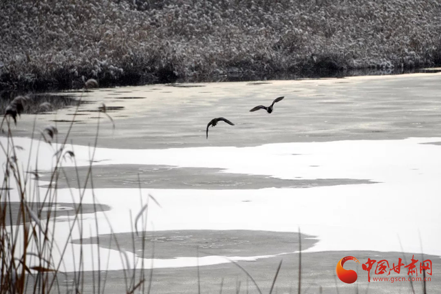 黑白相間的珍禽點綴尚未結(jié)冰的湖面