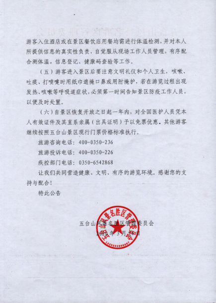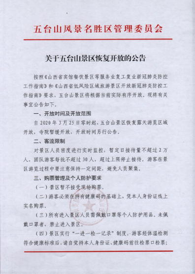 五臺山風景名勝區(qū)管理委員會對外宣布,自2020年3月25日零時起,山西五臺山風景名勝區(qū)恢復露天游覽區(qū)域開放,寺院暫緩開放,開放時間另行公告。