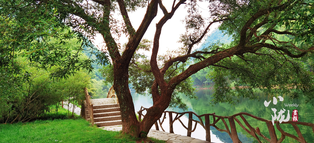 撐一葉竹筏在月牙潭之上,碧波蕩漾,山水一色,你能清晰的看見水底機靈的魚群,因你們闖入,驚慌的竄入沉積在水底的石縫中。遠遠望去,翠嶺逶迤,湖中碧波如鏡,嵐影倒懸,人在畫中游的意境躍然于心。