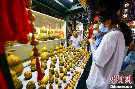 圖為游客購買刻葫蘆工藝品?!⊥醣筱y 攝