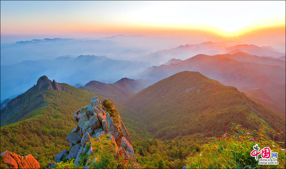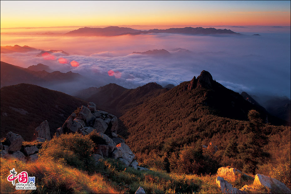 當(dāng)北京的第一縷陽(yáng)光從這里升起。站在海拔2118米的頂峰平臺(tái)上,遙望東方,天際中開(kāi)始露出幾抹灰色的浮云,隨后不斷地升騰、擴(kuò)大,繼而天邊漸紅,紅色越來(lái)越深,范圍越來(lái)越大,曙光漸露,丹霞輝映,把整個(gè)東方都變成濃濃的紅色。山峰在云霧中時(shí)隱時(shí)現(xiàn),彩云在天際間變幻,有時(shí)像奔馳的駿馬,有時(shí)像仙女飄逸,有時(shí)像玉樹(shù)瓊宮……千姿百態(tài),遐想無(wú)窮。猛然,比紅色的彩云更火紅、更光亮、更鮮艷的太陽(yáng)露出了一條邊弧,緩緩上升。四周的云霧似乎忍受不了她那光茫的照射而淡化、隱退,太陽(yáng)則很快掙脫了云霧與夜色的纏繞,迅速地上升,躍出天邊。霎時(shí),一輪紅日噴薄而出,金光四射,霞光瑞氣,照徹天宇,山巒、萬(wàn)樹(shù)沐浴著朝陽(yáng)的金輝,令人眼花繚亂。舉目四望,朝霞映照下的霧靈山,群峰起伏,云霧如海,波濤洶涌,九曲十八彎的旅游公路似戲水游龍,在峰巒間若隱若現(xiàn)。