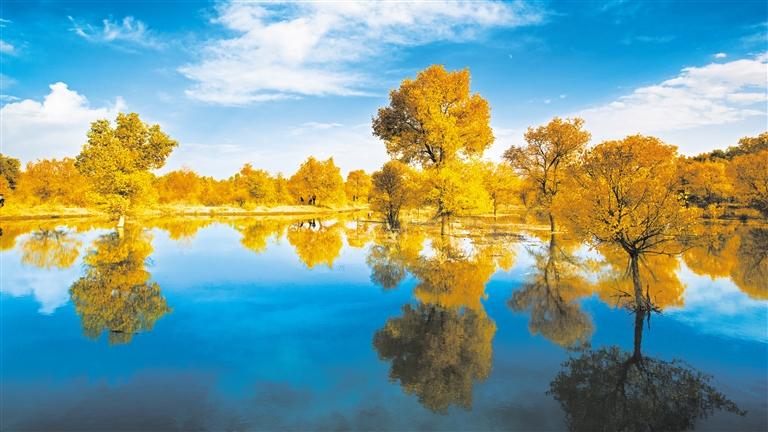 站在金波湖邊,滿目的赤橙黃綠與盈盈秋水互相映襯,胡楊金色的葉子倒映在潭水中,形成金色的水泊,微風(fēng)掠過(guò),層層漣漪漸漸擴(kuò)大,最后消失在胡楊的倩影里,構(gòu)成一幅幅精美的油畫。烘托出一幅“碧云天、黃葉地、秋色連波、波上寒煙翠”的絕美妙油畫卷。