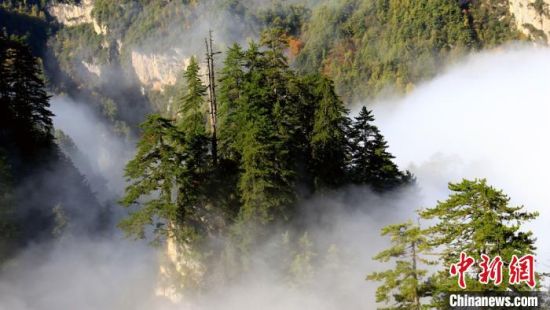10月上旬,甘肅省定西市漳縣貴清山國(guó)家森林公園,朝陽(yáng)在云層中若隱若現(xiàn),云遮霧繞的景象讓層巒疊嶂的山峰成為“云端村落”,仿若仙境。漳縣貴清山國(guó)家森林公園境內(nèi)原始森林遍布,森林、動(dòng)植物資源十分豐富,貴清山被譽(yù)為隴中的“小華山”,是生態(tài)旅游勝地。