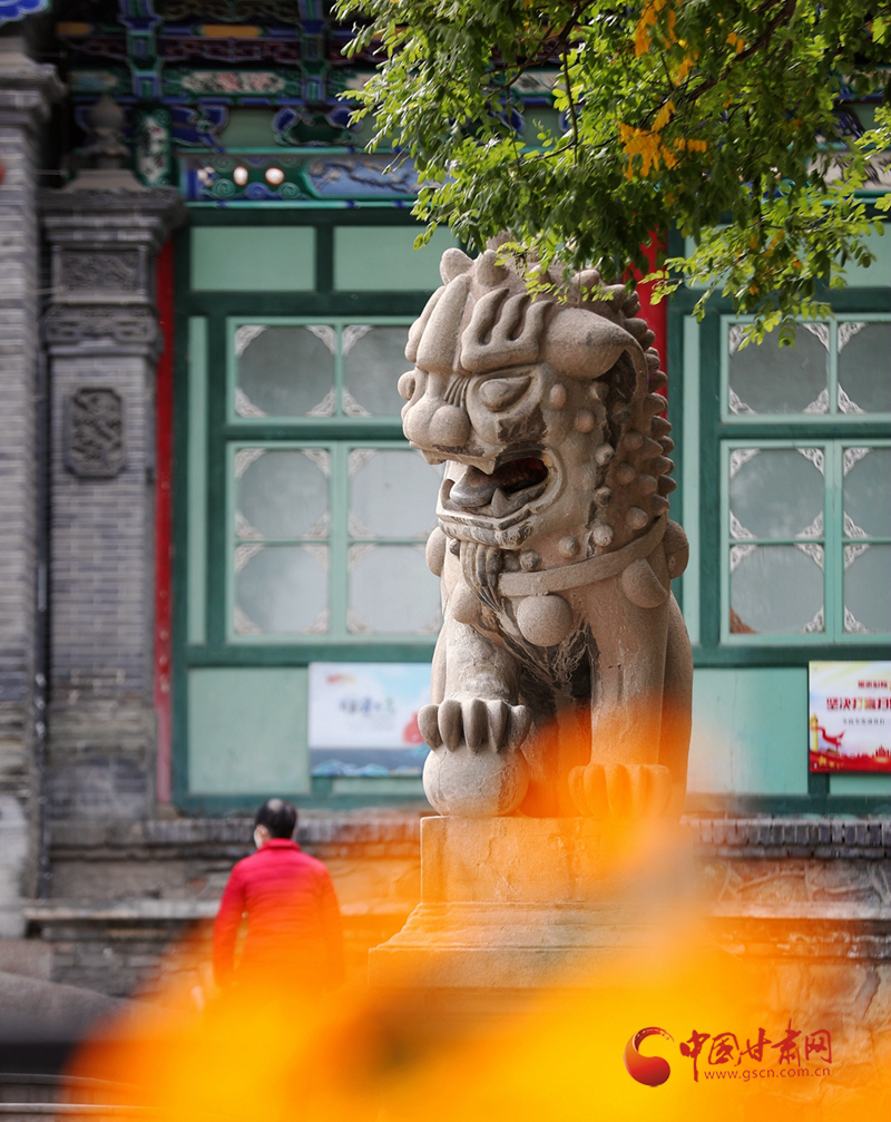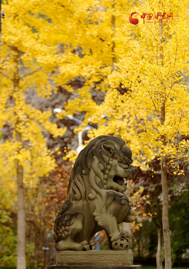 一片黃葉帶來秋的訊息,一片銀杏林則映襯一尊石獅子的美好時光,在五泉山,隨著深秋到來,銀杏泛黃,莊嚴(yán)的石獅與金黃的銀杏林產(chǎn)生了巧妙融合。在銀杏泛黃的時光里,石獅的威嚴(yán)中多了幾分恬靜。