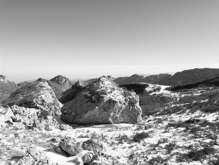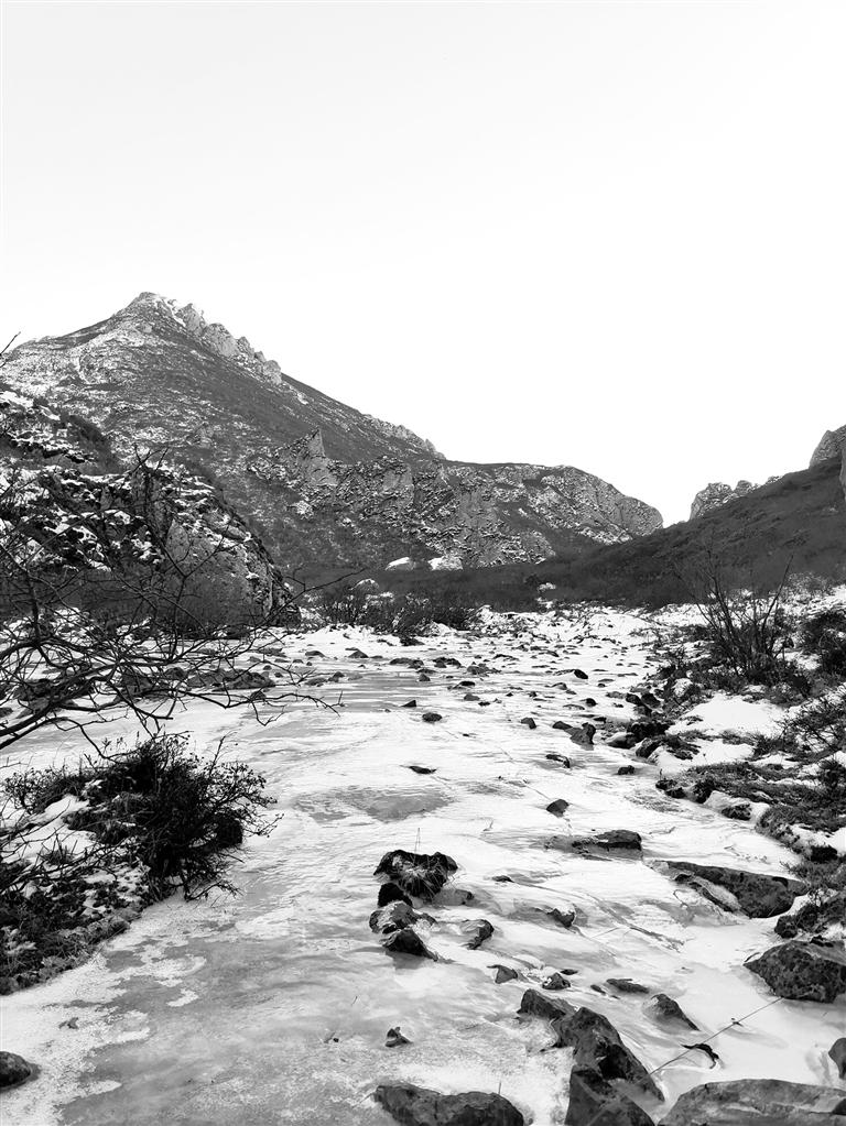 穿過公路就來到露骨山腳下,山間灌木叢生,枯葉凋零,一夜的小雪也使天空更加清澈。上山的路,總體是溯溪而上,不過腳下的小溪已經(jīng)變成冰河,但潺潺水聲不時在耳邊響起,大小石塊橫亙在冰河之上,白雪覆蓋其間,我們一行沿著前人在雪地留下的腳印,撥開齊胸的灌木枝,深一腳淺一腳、兜兜轉(zhuǎn)轉(zhuǎn)向前行。